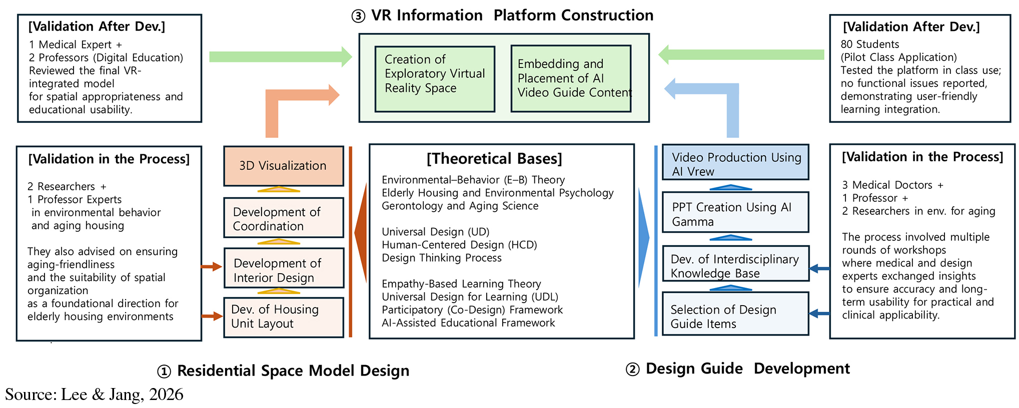 - This exploratory study investigates the learning effects of a VR-AI integrated information platform designed to support education on aging-friendly residential environments. As South Korea enters a super-aged society, the need to cultivate positive awareness and evidence-based understanding of elder housing among younger generations has become increasingly urgent. The platform combines immersive VR navigation with generative AI video guides offering multidisciplinary concepts. Six international undergraduate students participated in a short-term intensive workshop where they explored a VR model of an aging-friendly compact dwelling and accessed AI-generated instructional videos embedded at spatial points. Learning outcomes were examined across four dimensions: perceived enjoyment and usefulness, clarity of differentiated levels, changes in attitudes toward elderly housing, and reflections on the combined use of VR and AI. Survey results showed high interest and comprehension, while qualitative responses indicated greater empathy and more positive perceptions of elderly housing. Students also reported that the contextualized AI video guides enhanced engagement by presenting key concepts within spatial locations where such knowledge is most relevant. The findings indicate that VR-AI integrated learning promotes aging-friendly awareness and supports immersive and efficient learning. This study provides preliminary evidence for the applicability of immersive technology in gerontology-related design and for curriculum development in super-aged societies. - COLLAPSE