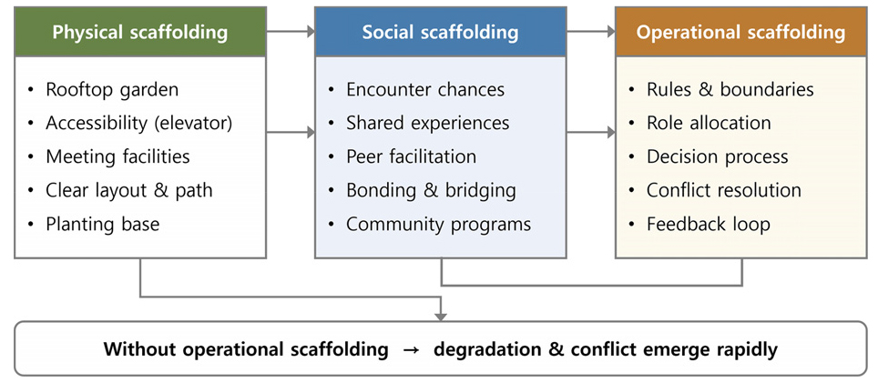 - This study examines the first transition to self-governance in a rooftop community garden within a senior public rental housing community and its resulting physical and social changes. Using a longitudinal qualitative case design, the analysis triangulated archival records, resident interviews, field observations, and expert assessments of landscape and ecological quality. The transition followed a trajectory of allocation, norm vacuum, ecological and sensory degradation, and subsequent attempts at recovery. Night-time relocations of favored plants, zone-based ownership signals, and vegetable monoculture disrupted the intended ecological rhythm and seasonality of the garden, while fertilizer misuse degraded olfactory comfort and reduced stay duration. Socially, participation fragmented into active, intermittent/neglect, and observer groups, accompanied by disputes over harvest rights, leadership frictions, and avoidance behaviors. These tensions revealed limits of participation-heavy models without codified rules or procedural safeguards. Over time, residents reframed the garden as a shared asset and converged on institutional scaffolding such as a wayfinding planting map, one-page rules, short learning-feedback loops, and low-cost dispute-resolution mechanisms. The findings show that rooftop community gardens function as essential physical, social, and operational infrastructure within senior community housing, shaping ecological quality, social cohesion, and everyday wellbeing. Ultimately, effective self-governance depends less on participation volume than on visible rules, procedural fairness, embedded learning, and mediation structures that stabilize shared spaces in super-aged societies. - COLLAPSE
