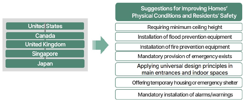 - The purpose of this study is to examine domestic and foreign codes and regulations regarding semi-basement housing units, and to suggest improvements needed for safe use as housing. Keyword searches from foreign codes and regulations and in-person interviews with HUD officials were conducted. As a result of reviewing the current building and residential codes and regulations of vulnerable housing, focusing on semi-basement housing, the identified problems were related to 1) minimum standards for indoor and outdoor environments that were not suitable for residency and 2) the evacuation and fire safty standards that were difficult to apply to the half-basement units. Above all, considering that semi-basement housing units are vulnerable to flooding and fire, it is urgent to prepare safety-related standards for this type of dwellings. Inclusive and detailed codes and regulations should be established so that these units can serve as safe housing in the future. - COLLAPSE